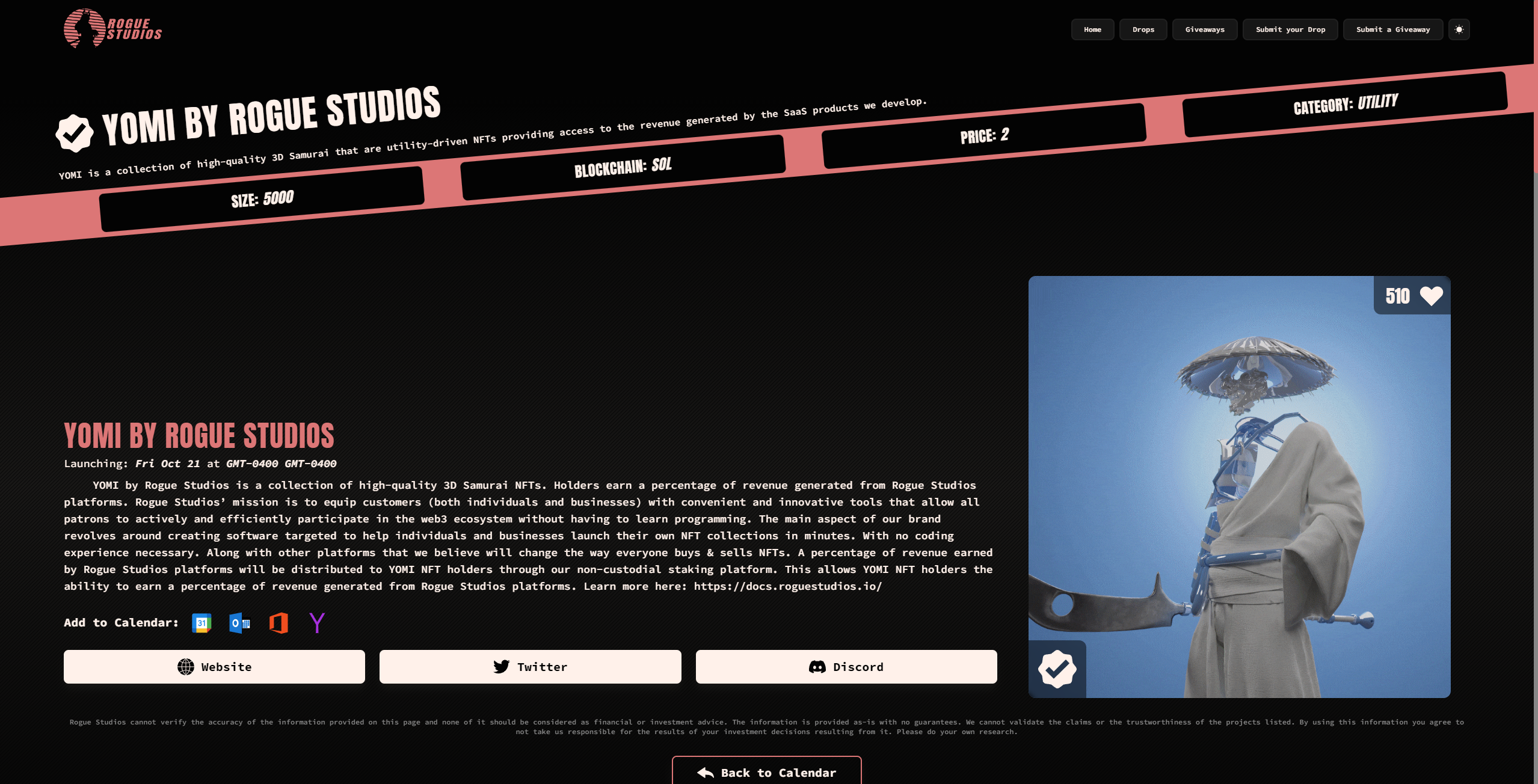 The Rogue Radar provides key details surrounding upcoming NFT projects using a modern UI/UX design. Each collection includes details like the drop date, project information, mint price, social media profiles, and more. The navigation is seamless and helps save time when searching for upcoming mints.