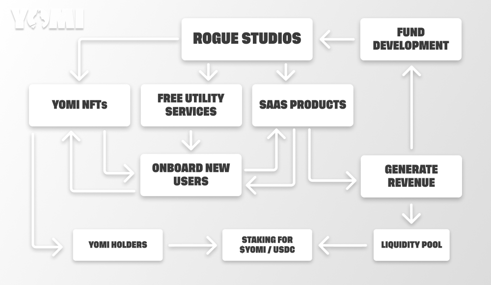 ***Our revenue-sharing model distributes 50% of the profit generated by Rogue Studios Self-Hosted Marketplaces (SHMs) to YOMI NFT holders*****.** Rogue Studios will offer *staking* for all holders of YOMI NFTs. Staking gives YOMI NFT holders the ability to earn a percentage of revenue generated from Rogue Studios SHMs.